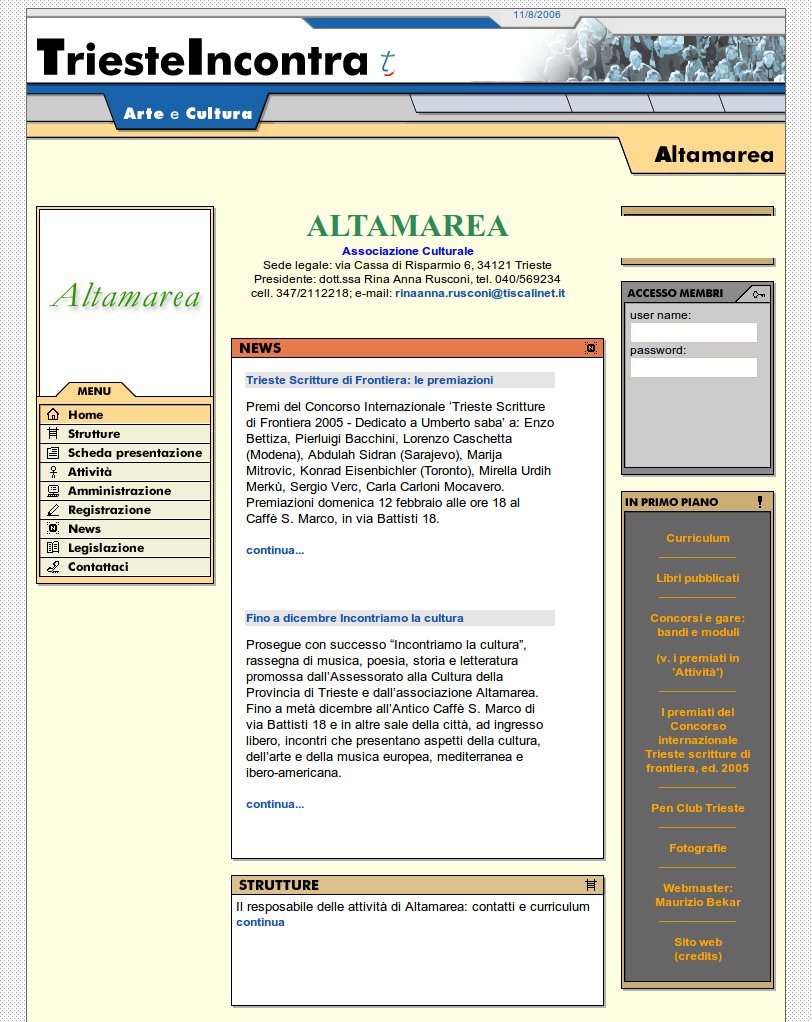 Il nuovo sito web di Altamarea, realizzato e gestito dal 2007 da Maurizio Bekar, che cura anche diversi uffici stampa dell'associazione. Documenta tutte le attività svolte da Altamarea dal 1997 e annuncia quelle programmate. Nel 2013 conta circa 200 pagine, 500 foto e 60 documenti scaricabili. Sviluppato con Dreamweaver in html 4.01, con templates, librerie e fogli di stile ex novo. Con caratteri scalabili per agevolare la lettura e motore di ricerca all'interno del sito.